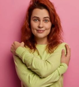 Допоможуть самообійми. Можна прикласти власні долоні до серця, живота, погладити себе по руці. Можна обійняти себе руками та погладити або легкими ритмічними поплескуваннями постукати себе по плечах, відчуваючи власні межі: “де я починаюся і де закінчуюся”. Ритмічні рухи та дотики концентрують увагу на тілі, відволікаючи від тривожних думок. Вчені виявили, що обійми – навіть, якщо це плюшевий ведмедик – допомагають заспокоїти внутрішні страхи. Міжособистісний дотик – настільки потужний механізм, що навіть предмети, які можуть імітувати дотик іншої людини, допомагають прищепити відчуття спокою та безпеки.